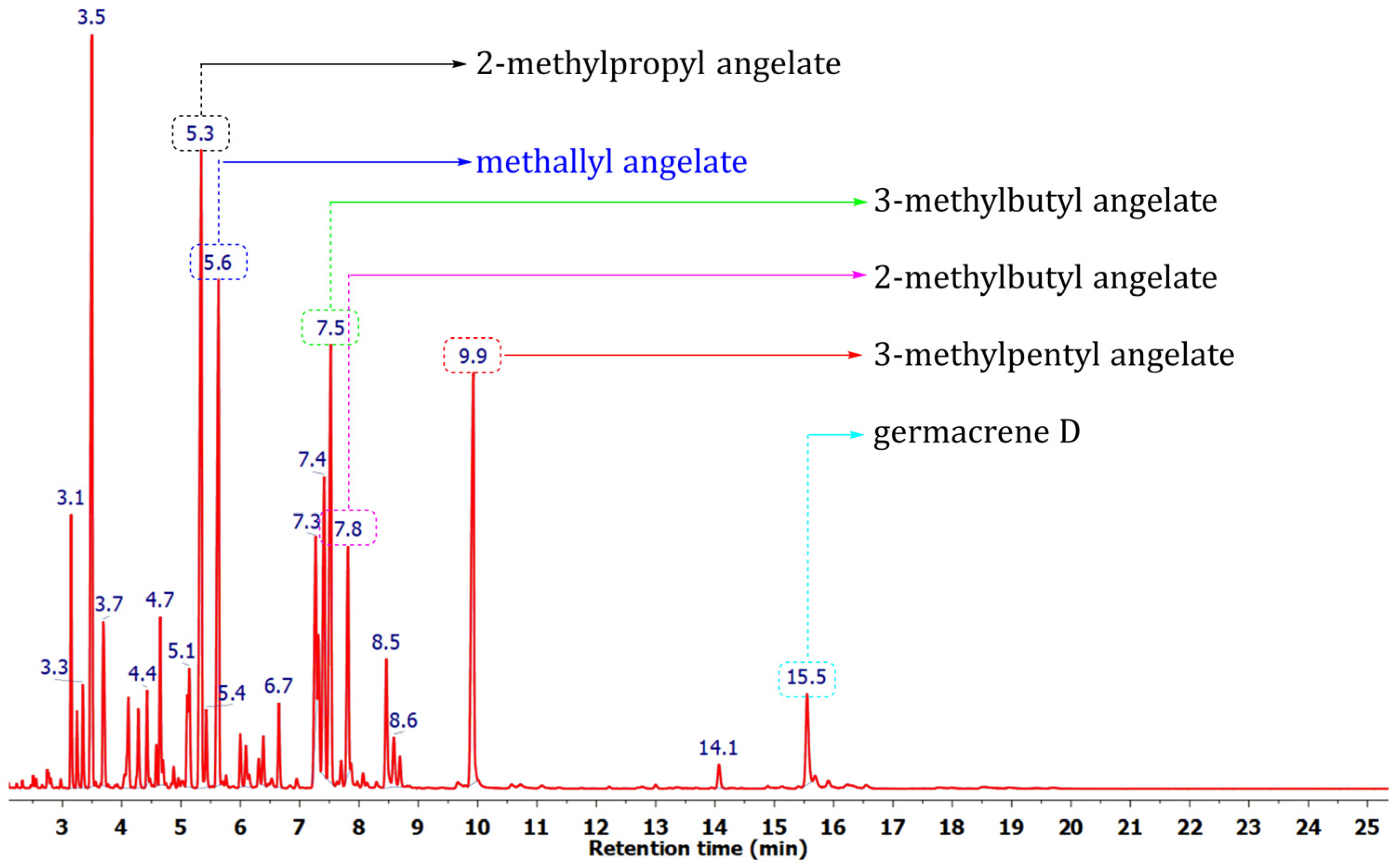 The identification of the above-mentioned tiglate and senecioate esters further prompted us to conduct an additional screening of the samples using partial ion current (PIC) chromatograms, specifically by monitoring characteristic ions for angelates, tiglates, and senecioates (m/z 55, 83, 100, and 101). The PIC chromatograms indicated the presence of an entire series of angelates, tiglates, and senecioates, comprising a total of 44 constituents (Figure S77). The identity of the majority of these compounds was ultimately confirmed through co-chromatography of the EO samples with synthesized standards of homologous series of angelates, tiglates, and senecioates (Table 1).