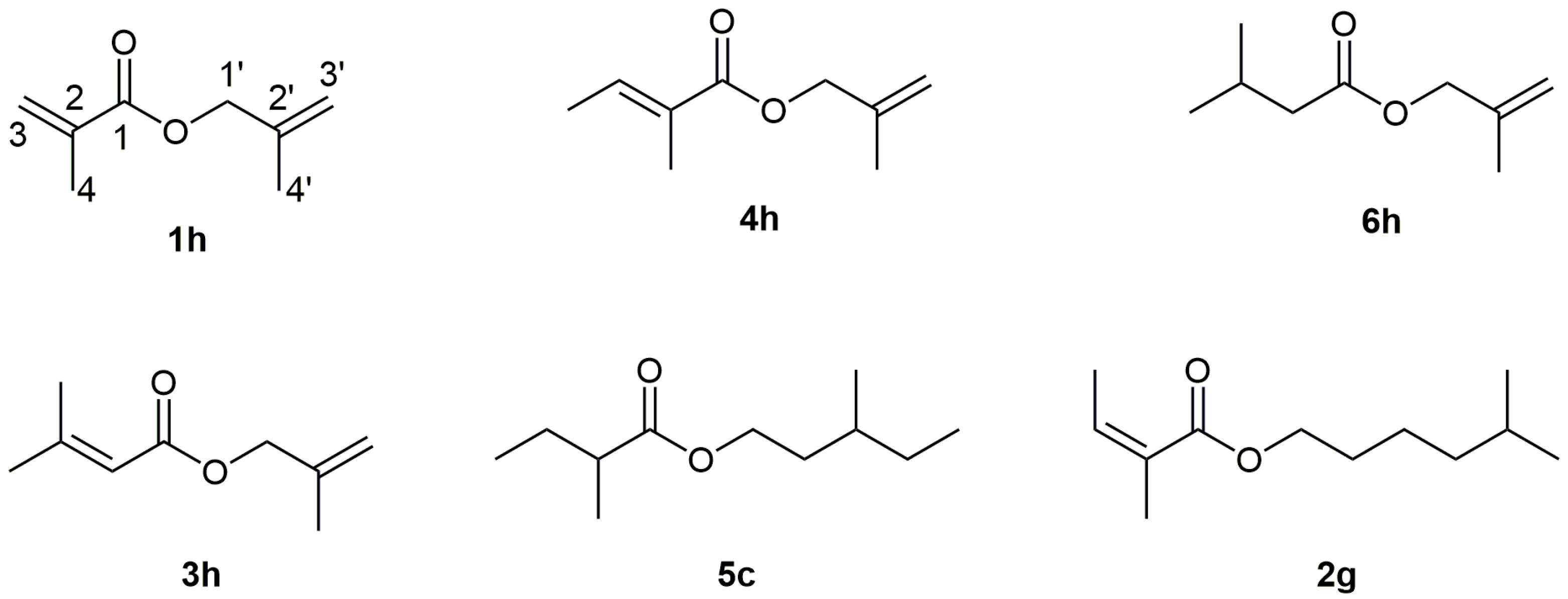 2-Methylprop-2-en-1-yl 2-methylprop-2-enoate (1h; syn. methallyl methacrylate) [21]: Yield: 79%; RI = 947 (DB-5MS); MS (EI), m/z (%) 125(5), 95(6), 70(6), 69(100), 67(3), 55(19), 53(7), 43(6), 41(61), 39(50); 1H NMR (CDCl3, 400 MHz): δ 6.15 (doublet of quartets, J = 1.6, 1.0 Hz, 1H, Ha-3), 5.59 (pseudo quintet J = 1.6 Hz, 1H, Hb-3), 5.00 (pseudo triplet of quintets, J = 1.6, 0.8 Hz, 1H, Ha-3′), 4.95–4.93 (multiplet, 1H, Hb-3′), 4.58 (broad singlet, 2H, H-1′), 1.97 (doublet of doublets, J = 1.6, 1.0 Hz, 3H, H-4), 1.78 (broad doublet of doublets, J = 1.6, 0.8 Hz, 3H, H-4′); 13C NMR (CDCl3, 101 MHz): δ 167.06 (C-1), 140.02 (C-2′), 136.27 (C-2), 125.61 (C-3), 112.64 (C-3′), 67.84 (C-1′), 19.52 (C-4′), 18.34 (C-4).