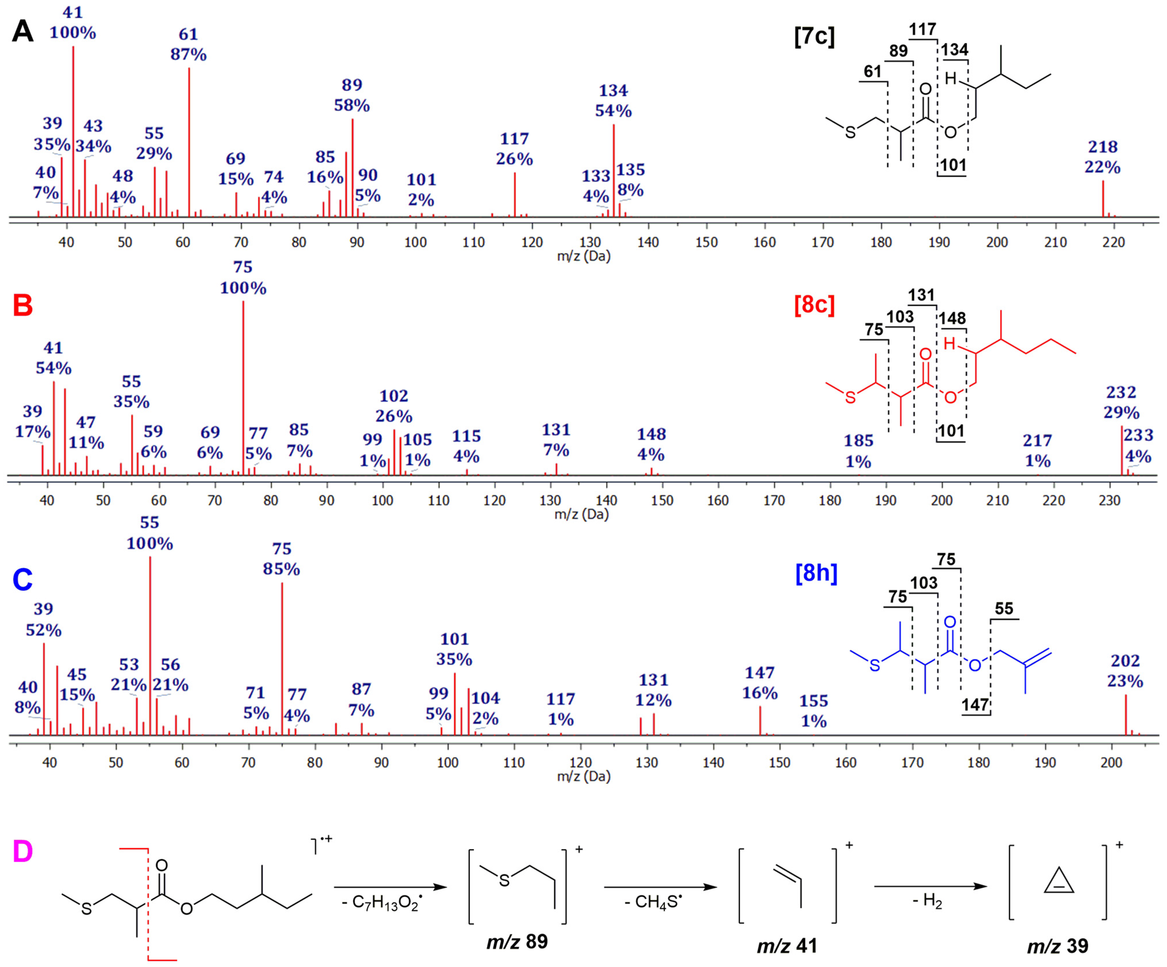 2-Methylallyl 2-methyl-3-(methylthio)butanoate (8h): RI = 1358 (DB-5MS); MS (EI), m/z (%) 202(23), 147(16), 131(12), 101(35), 99(5), 87(7), 75(85), 71(5), 56(21), 55(100), 53(21), 45(15), 40(8), 39(25).