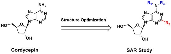 Despite its anti-fibrotic potential, the therapeutic efficacy of cordycepin is modest, and research on the structure–activity relationship (SAR) for its derivatives is lacking. Herein, we designed and synthesized a series of cordycepin derivatives by incorporating alkyl groups to the C6-NH2 and/or small substituents (halogen and hydroxyl group) at the C2 position (Figure 2). These compounds were screened in the human hepatic stellate cell line LX-2 for the activity of inhibiting the mRNA expression of the fibrotic marker α-SMA [30]. The C2, N6-dual substituted cordycepin derivatives exhibited favorable α-SMA-inhibiting activities, and a preliminary investigation on the mechanism of action was conducted.