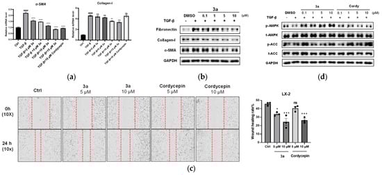 Adenosine monophosphate-activated protein kinase (AMPK) plays a crucial role in regulating energy metabolism that is closely related to the progression of liver fibrosis [42]. It has been reported that AMPK activation can inhibit HSC activation and reduce liver fibrosis [43]. Cordycepin has also been reported to ameliorate hepatic fibrosis in models of nonalcoholic steatohepatitis (NASH) through AMPK pathway activation [27]. We therefore preliminarily investigated whether our synthetic analog 3a might interact with this key pathway, including cordycepin as a control. We found that treatment with 3a effectively increased phosphorylation of AMPK and its downstream target ACC (Figure 3d). While this demonstrates an interaction with the AMPK pathway, the extent to which this specific interaction contributes to its anti-fibrotic activity remains to be determined.