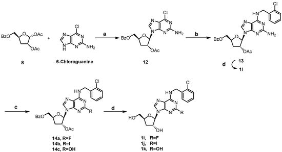 Synthesis of compounds 1i~1l. Reagents and conditions: (a) N, O-bis(trimethylsilyl)acetamide, TMSOTf, ACN, 80 °C; (b) 2-chlorobenzylamine, TEA, ethanol, 60 °C; (c) i. tert-butyl nitrite, 70% pyridine hydrofluoride, −40 °C for 14a; ii. I2, diiodomethane, cuprous iodide, tert-butyl nitrite, THF, 80 °C for 14b; iii. tert-butyl nitrite, water: isopropanol (v:v = 1:1), 0 °C to rt for 14c; (d) 7N NH3/MeOH, 50 °C.