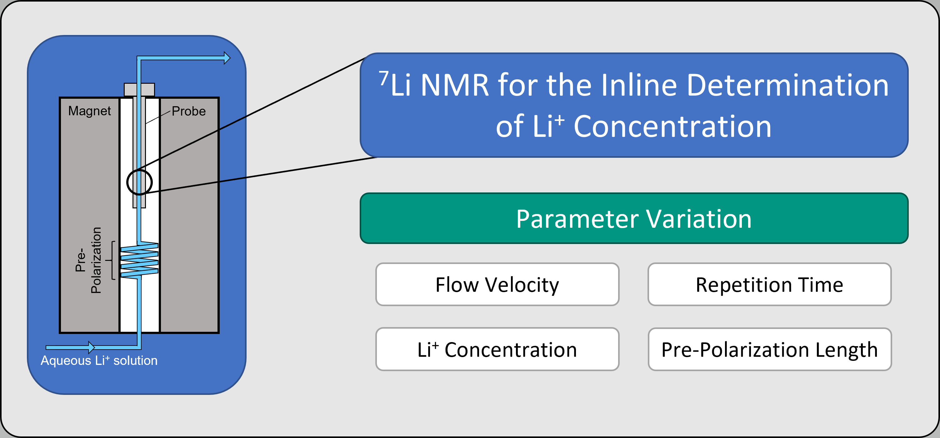 In this study, 7Li NMR on flowing aqueous lithium chloride (LiCl) solutions was performed with a superconducting, cryogen-free magnet at a B0 of 4.7 T as a basis for the development of an inline-capable measurement method for monitoring the lithium concentration in process streams during lithium extraction. In addition to the influence of lithium concentration, the influences of flow velocity, repetition time, and polarization length were also investigated. A compact, industrial-grade Bruker minispec NF instrument was used as electronic unit in order to realize a potentially mobile and space-saving setup.