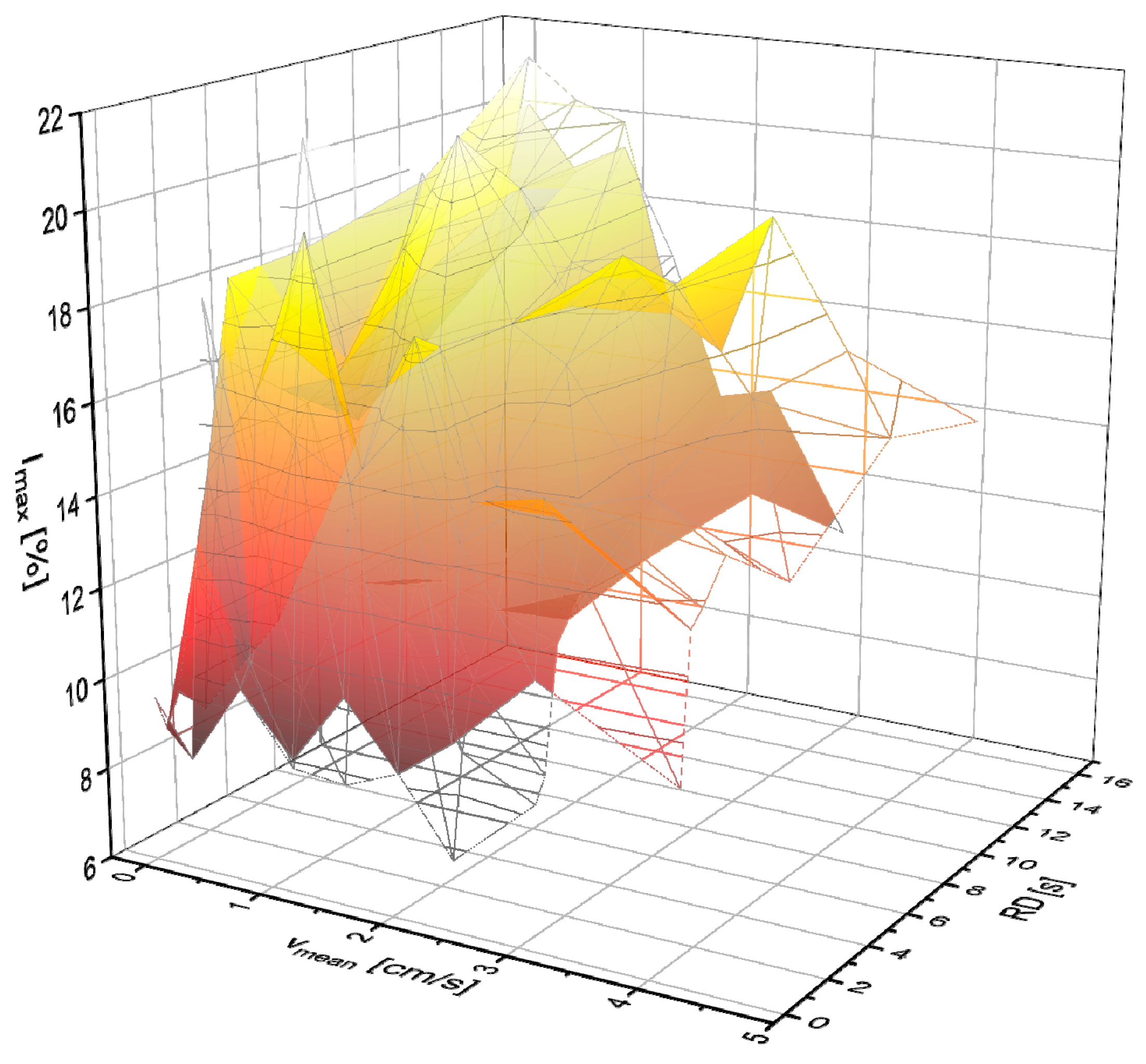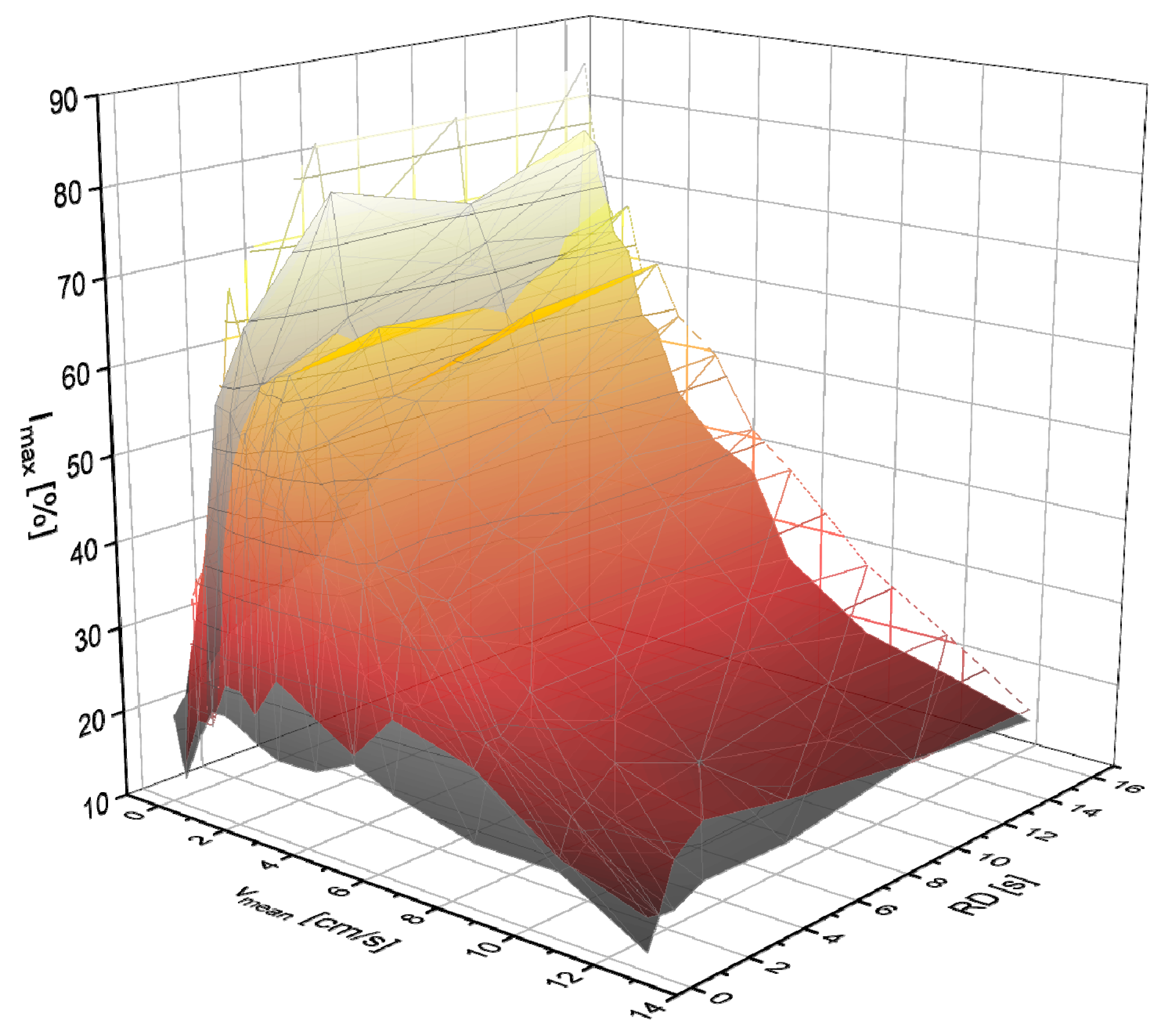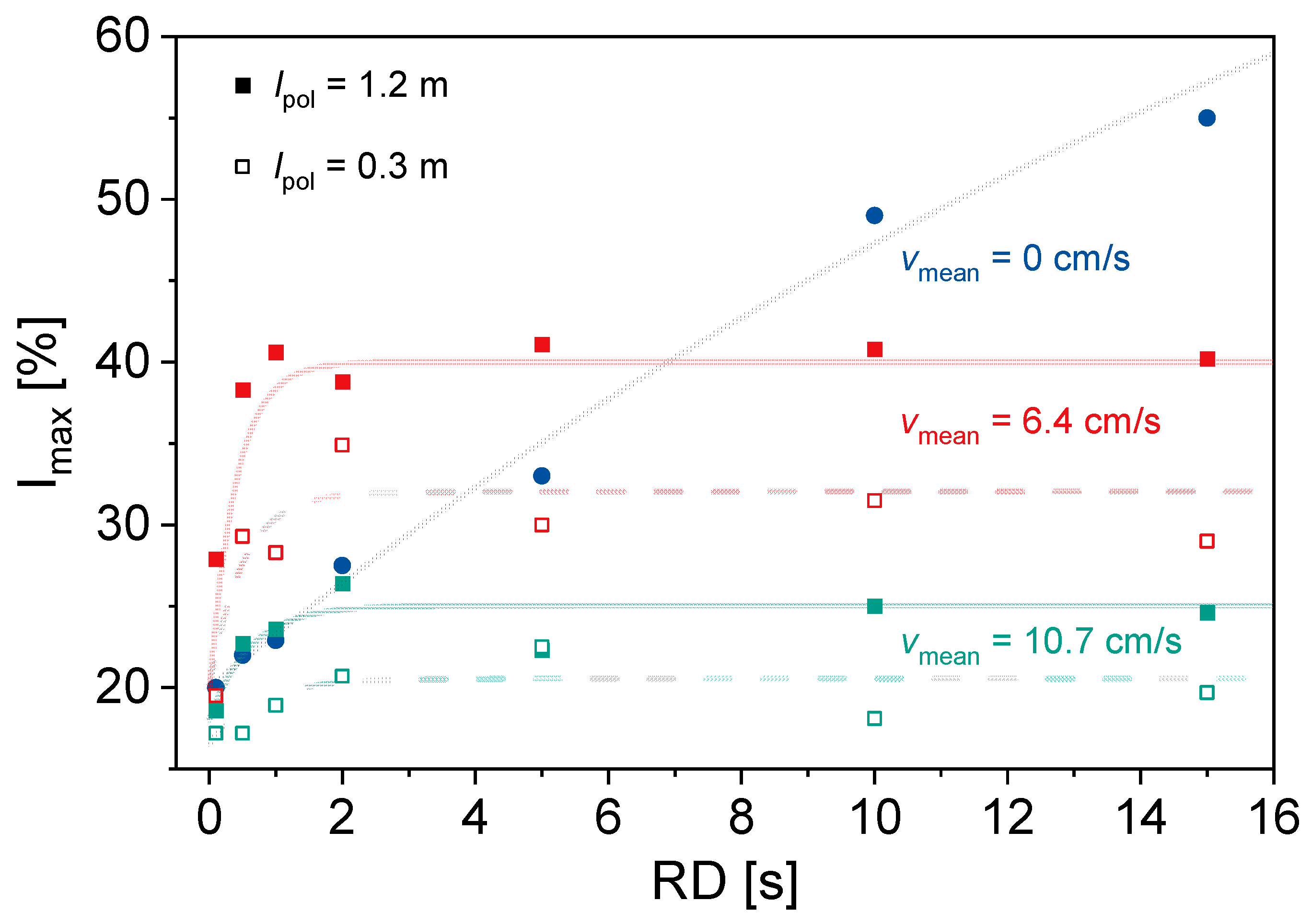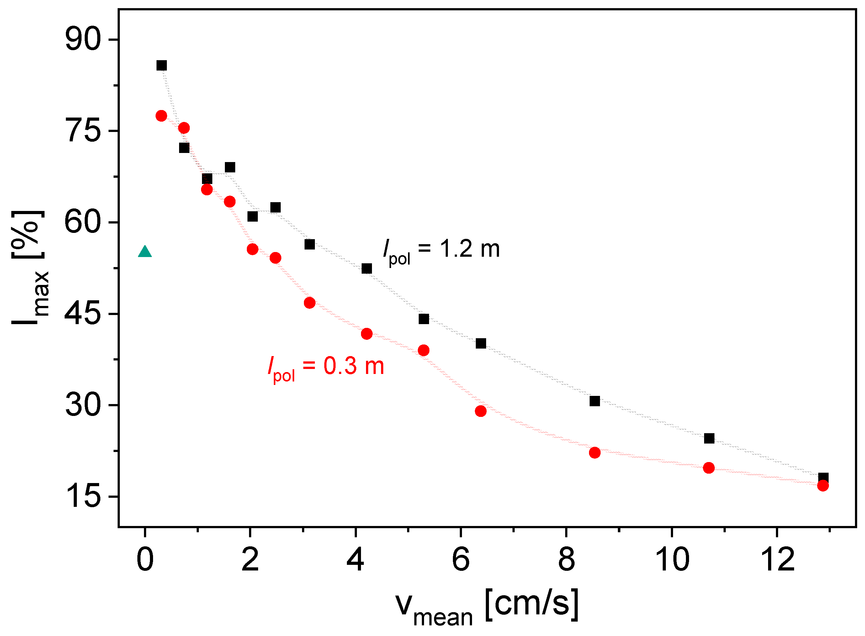 Also, at smaller concentrations, the positive influence of the longer lpol on Imax is clear. The experiments with smaller cLiCl reveal the limitations of the current measurement setup in terms of Li+ concentration and flow velocity range.