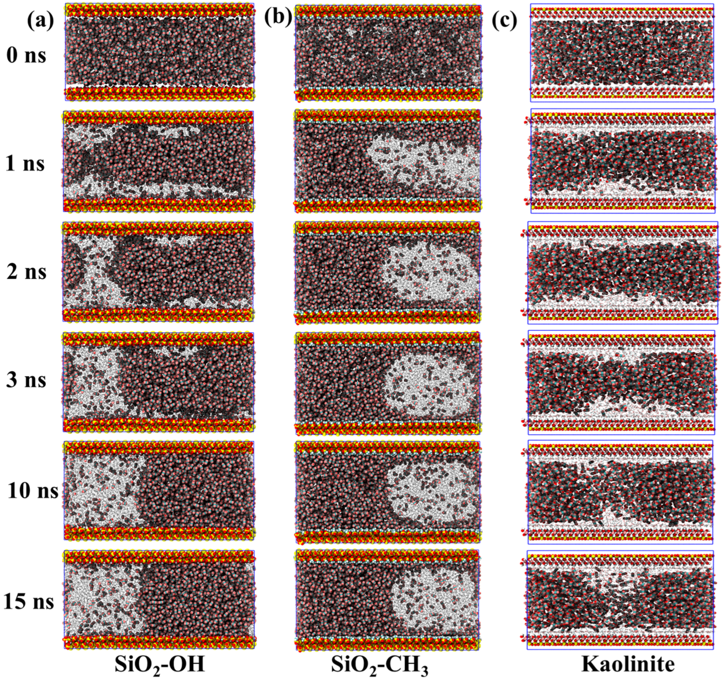 Overall, the observed differences indicate that mineral surface chemistry governs water structuring and phase stability, where hydrophobic surfaces confine water into isolated droplets, moderately hydrophilic surfaces promote asymmetric wetting and interfacial rearrangement, and strongly hydrophilic clay surfaces facilitate continuous water film formation and bridge development that ultimately dissects the CO2 domain.