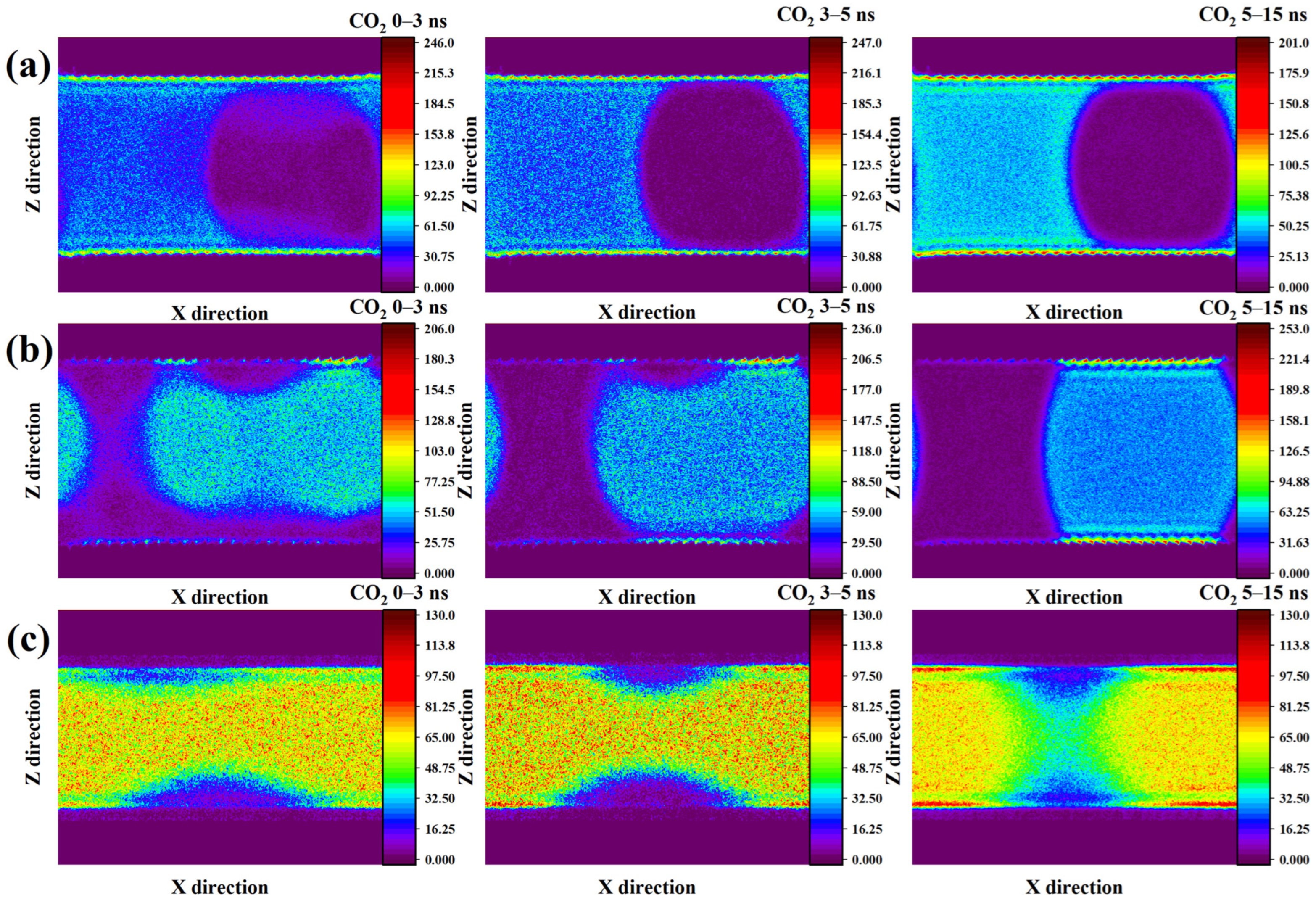 2 density becomes more pronounced and expands laterally. During the later stage of the trajectory (5–15 ns), the system reaches a stable phase-separated configuration, with the left portion of the pore dominated by the aqueous phase and the right region fully occupied by CO