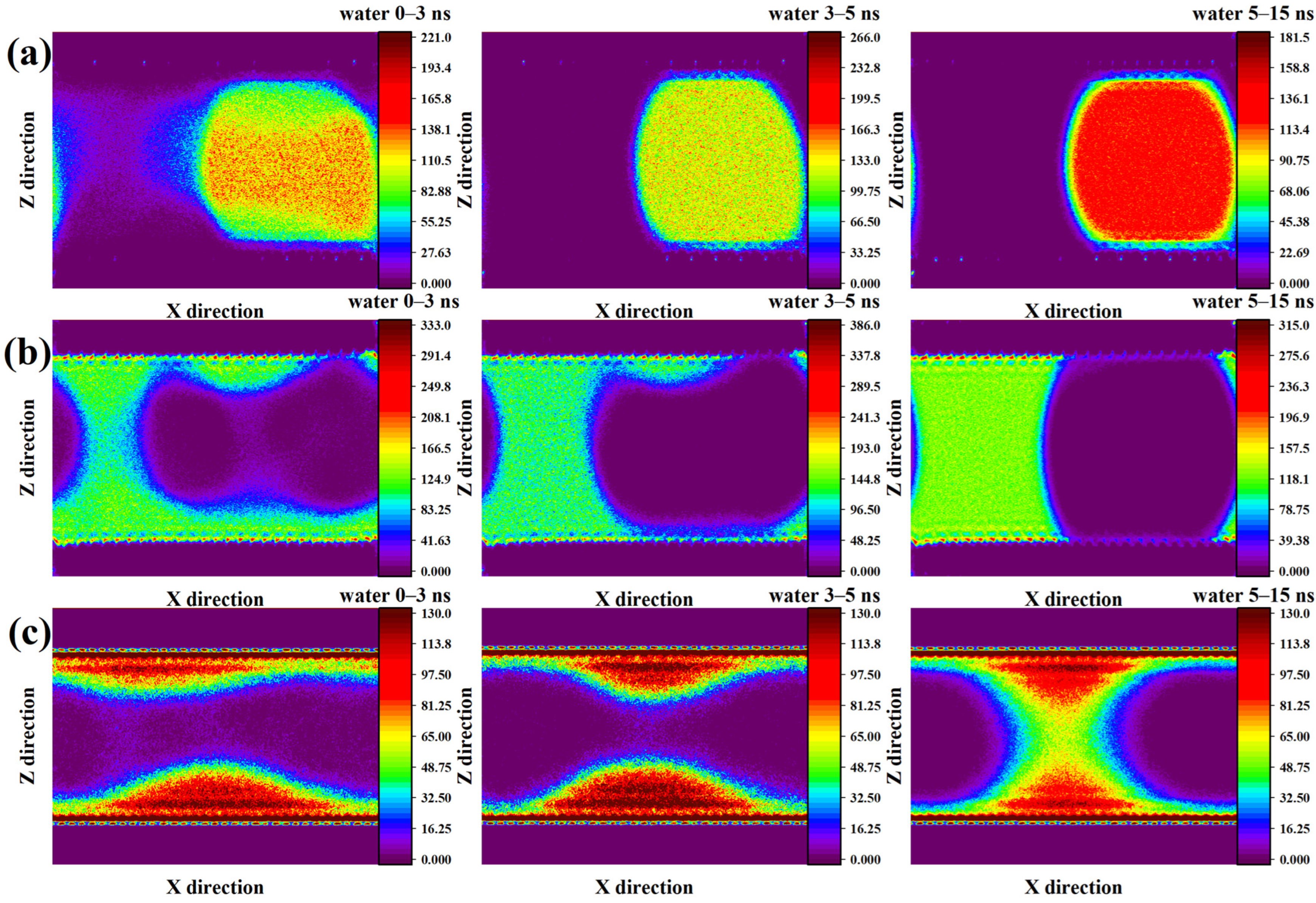 2 surface is observed at this stage. Between 3 and 5 ns, the water cluster becomes more compact, and its density distribution progressively homogenizes. The boundaries of the cluster also appear smoother, indicating enhanced structural stability. From 5 to 15 ns, the core density continues to increase significantly, while a sharp decline in density emerges at the gas–water interface. This trend implies further molecular packing within the bulk region and limited interaction with the hydrophobic surface.
