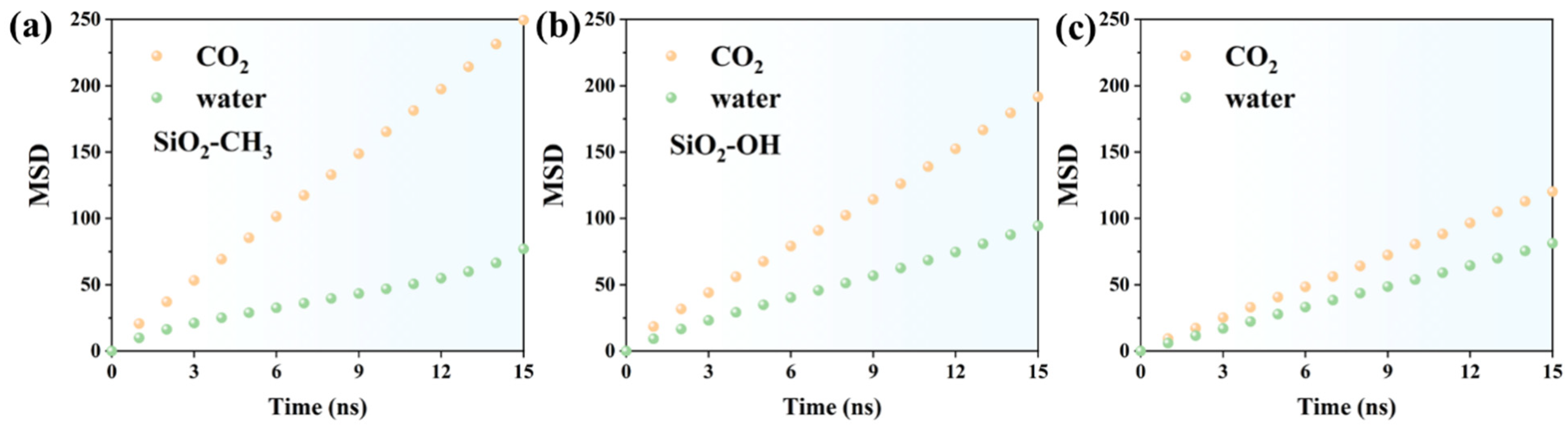 Overall, the MSD results reveal distinct mobility regimes governed by surface chemistry. The methylated SiO2 system exhibits the weakest interfacial confinement, allowing CO2 to diffuse rapidly while water remains comparatively restricted, resulting in the largest mobility contrast among the three systems. In contrast, the hydroxylated SiO2 interface moderates this disparity; both CO2 and water maintain continuous diffusion but with strengthened surface coupling, leading to a more balanced transport response as hydrogen-bonding interactions become more influential. The kaolinite system presents the strongest confinement effect, where both species show substantially lower MSD values and a notably reduced mobility gap. This behavior indicates that the hydrophilic mineral framework, together with its dense surface hydroxyl environment, stabilizes interfacial water layers and suppresses CO2 motion through persistent molecular interactions. Taken together, these observations demonstrate that increasing mineral hydrophilicity systematically transitions transport behavior from free diffusion toward structured, interaction-controlled mobility, with kaolinite representing the most restrictive boundary for both water and CO2 at the mineral–fluid interface.