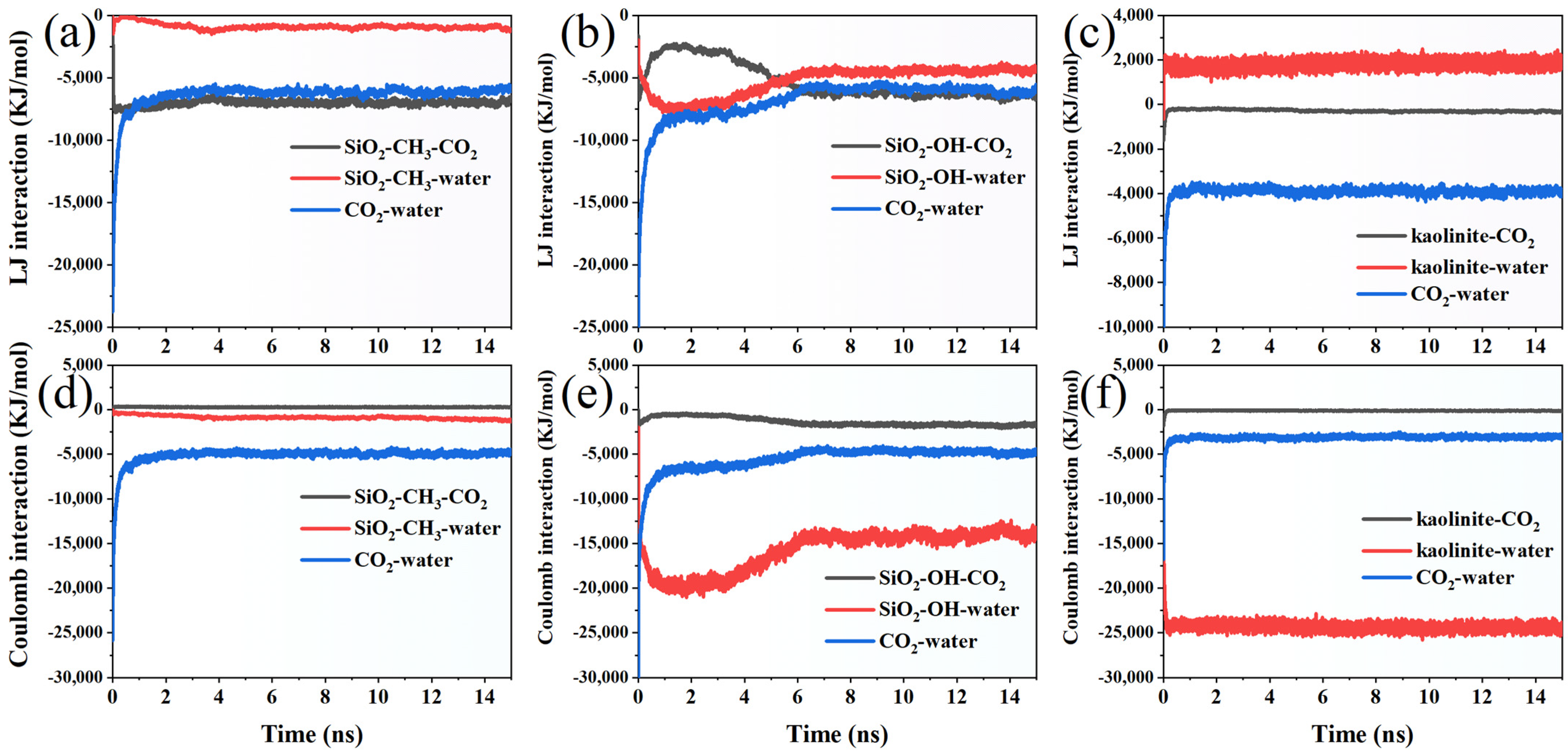 2 conditions, the Lennard–Jones and Coulombic interaction energies among the different components were evaluated across the three representative mineral environments. The LJ energy between the methylated SiO