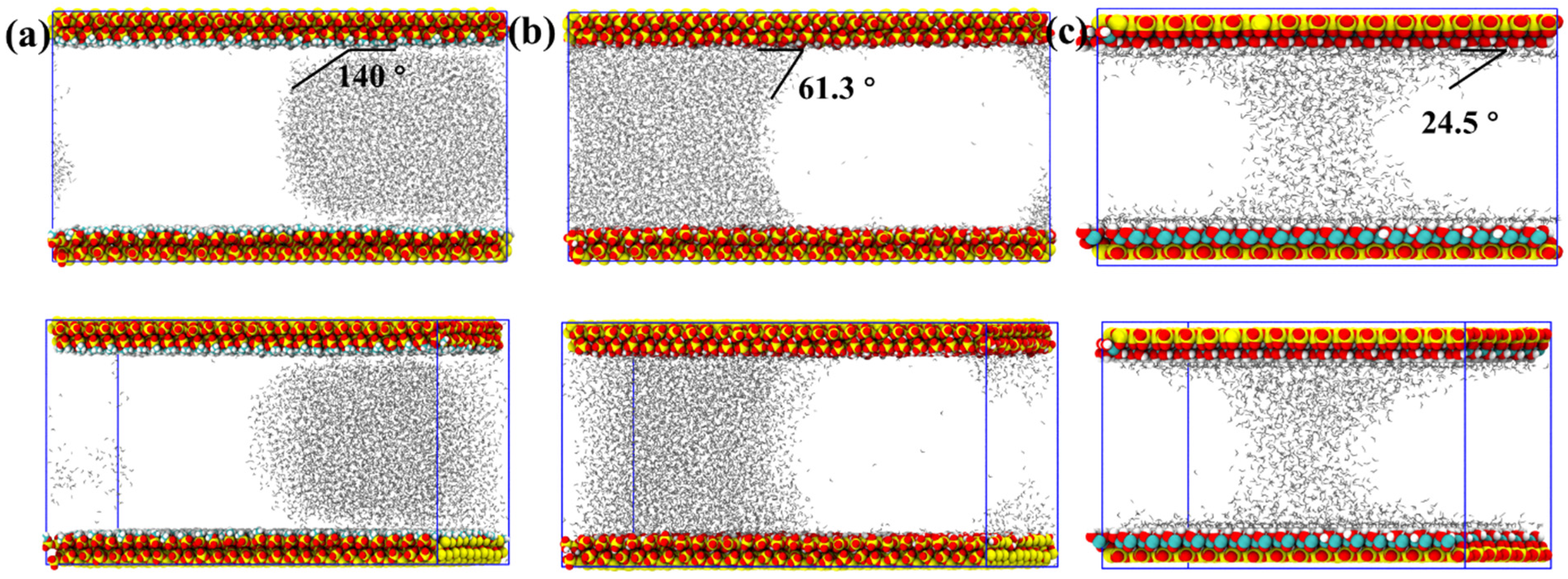 2 walls and the larger effective contact area with both upper and lower surfaces. The corresponding contact angle decreases markedly to 61.3°. Kaolinite exhibits an even stronger hydrophilic character, with a contact angle of only 24.5°. In this case, water forms a continuous bridge that links the upper and lower mineral surfaces, illustrating its pronounced tendency for interfacial wetting and structural coherence within the slit (