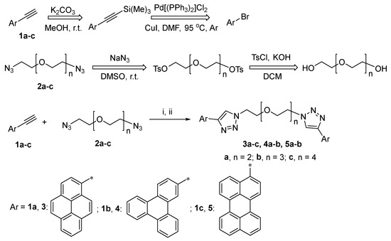 In order to synthesize a series of PEG-linked bis-4-(PAH)-1,2,3-triazoles, such as 3a–c, 4a,b and 5a,b, in a frame of current research, two approaches were investigated (Scheme 1)—namely, “click” reactions between azide-substituted PEG with a PAH-containing ethynyl component in solution or under ball-milling conditions. 1-Ethynylpyrene 1a was prepared as an ethynyl component from 1-bromopyrene, according to the previously reported method [57]; several PEG-based azido components 2a–c have been prepared as azido components, according to the previously reported method [58], starting from the corresponding PEG bis (tosylates).