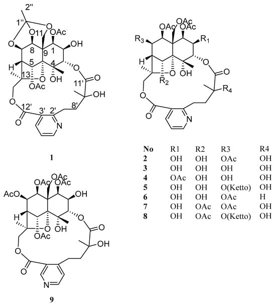 The five known compounds 5–9 were identified as tripterygiumine T (5) [11], 5-deacetylwilforjine (6) [6], tripfordine A (7) [12], chiapenine ES-IV (8) [9], and wilfordsuine (9) [13], by comparison of their spectroscopic data with reported data.