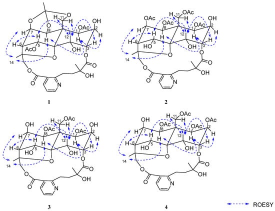 The relative configuration was determined through analysis of the ROESY spectrum. Key correlations observed between H-8/H-1α, H-7, and H-14; H-12/H-3, H-5, and H-11β; and H-1/H-2 indicated that the stereochemistry of the oxygenated substituents was consistent with that of 2 (Figure 3), assigned as 1β, 2β, 3α, 4α, 5α, 7β, and 8β. In conclusion, the structure of compound 3 was determined as shown in (Figure 1). It is identified as the 7-deacetyl analogue of 2 and was consequently named 2,5,7-trideacetylalatusinine.