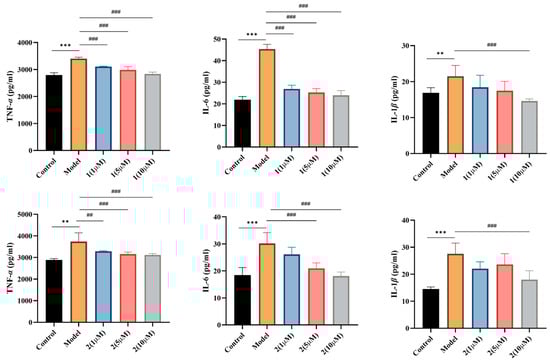Compounds 1 and 2 significantly reduced the release levels of key inflammatory mediators TNF-α, IL-6, and IL-1β. (** p < 0.01, *** p < 0.001) vs. control group; (## p < 0.01, ### p < 0.001) vs. model group.