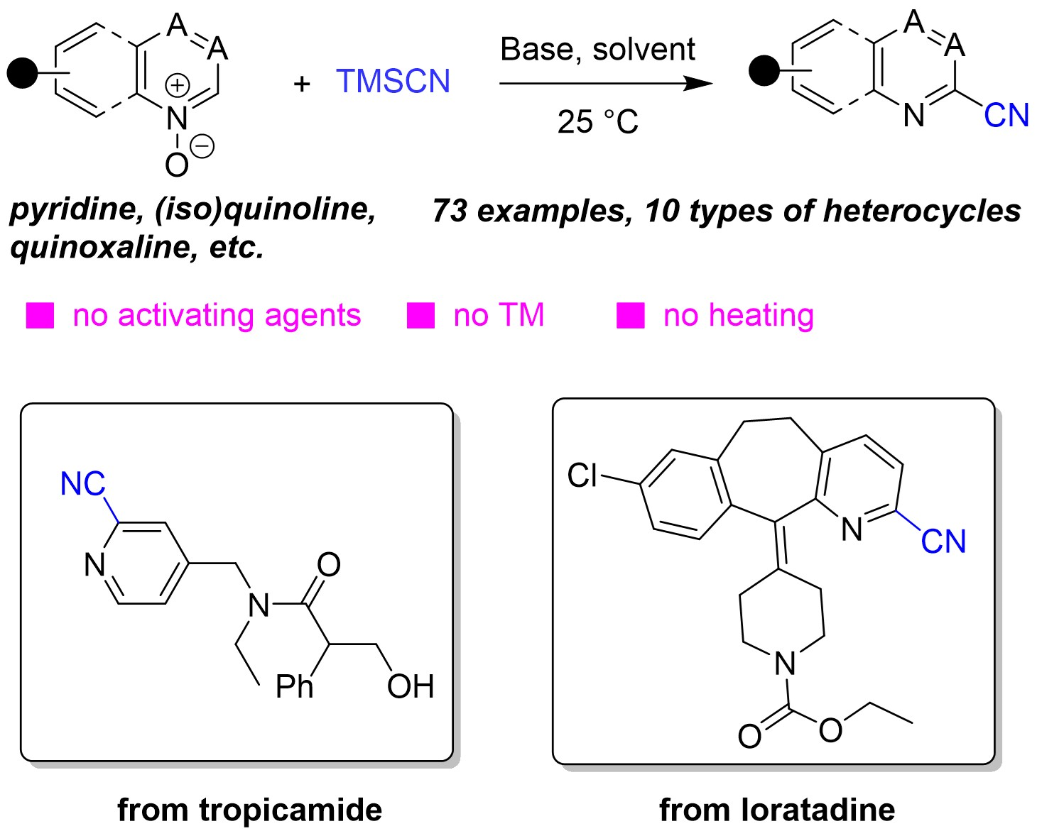 Chicago/Turabian StyleXiao, Hua, Reziyamu Wufuer, and Dong Wang. 2026. "Formal Synthesis of Ortho-Cyanated N-Heterocycles via Direct, Metal-Free Cyanation of N-Oxides Under Benign Conditions" Molecules 31, no. 2: 276. https://doi.org/10.3390/molecules31020276