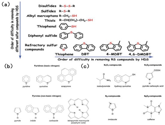 Energy and environmental issues have long been recognized as a major stumbling block to social development [1]. The continuous increase in energy consumption has led to the depletion of low-sulfur and low-nitrogen crude oil, resulting in increasingly serious air pollution. Concurrently, unconventional fuel resources such as oil shale, oil sands and coal have been exploited to obtain high-sulfur crude oil [2]. The sulfur and nitrogen-containing compounds (SCCs and NCCs) found in liquid fuels are the primary cause of air pollution and extreme weather conditions, including haze and acid rain [3]. This phenomenon gives rise to a series of issues, including, but not limited to, soil acidification and building corrosion. The presence of SOx in the atmosphere has been demonstrated to combine with other pollutants to form carcinogens such as PM2.5, which have been shown to cause severe damage to the human respiratory system [4,5]. Concurrently, NOx undergoes a chemical reaction with VOCs under ultraviolet radiation to generate photochemical smog, which has been demonstrated to irritate the skin and respiratory system. The organic nitrogen present in fuel displays strong oxidizing activity. While in storage, it is susceptible to a reaction with oxygen, resulting in the formation of gum and sediment. In fuel vehicle systems, the resulting sulfur oxides and nitrogen oxides are absorbed by the engine oil, accelerating its ageing and causing corrosion of the engine and exhaust system [6]. In addition, diesel engines produce more nitrogen oxides [7]. The six pollutants announced by the EPA include particulate matter, ozone, carbon monoxide, sulfur oxides, nitrogen oxides and lead. In the Tier 3 standards implemented by EPA, the NOx limit is further reduced to 0.01 g/mile, and it is expected that in the new regulations in 2027, the NOx limit will be further reduced to 0.02 g/bhp hr. The minimum requirement for SO2 emissions from factories is an emission limit of 100 mg/m3. In 2021, the US Environmental Protection Agency also recognized the close connection between sulfur and nitrogen compounds in air pollution and atmospheric chemistry, combining the study of the two substances.