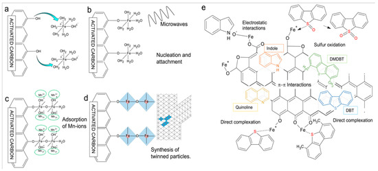 (a–d) Proposed steps for the formation of twinned particles in material F4-FeMn. Reproduced with permission from Ref. [75]. Copyright 2019 Elsevier. (e) Proposed adsorption mechanism of several molecules studied on the surface of the iron-modified activated carbon. DMDBT stands for 4,6-dimethyldibenzotiophene and DBT for dibenzothiophene. Reproduced with permission from Ref. [75]. Copyright 2019 Elsevier.