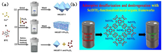 - Tan, P.; Xie, X.-Y.; Liu, X.-Q.; Pan, T.; Gu, C.; Chen, P.-F.; Zhou, J.-Y.; Pan, Y.; Sun, L.-B. Fabrication of magnetically responsive HKUST-1/Fe3O4 composites by dry gel conversion for deep desulfurization and denitrogenation. J. Hazard. Mater. 2017, 321, 344–352. [Google Scholar] [CrossRef]