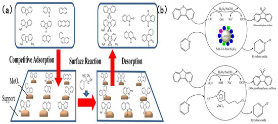 In addition to the two types of catalysts discussed earlier, numerous studies have adopted supports including Al2O3 to fabricate highly efficient catalysts for simultaneous oxidative desulfurization and denitrogenation (ODS/ODN). Safa et al. [94] prepared a 12 wt% MoO3/γ-Al2O3 catalyst, using 80% cumene hydroperoxide as the oil-soluble oxidant, the active site of the catalyst adsorbs CHP and decomposed it into two strong oxidation species, t-Buo• and Mo6+-O-O-t-Bu and carried out an in-depth investigation into the mechanism underlying the influence of nitrogen compounds and polycyclic aromatic hydrocarbons (PAHs) on the oxidative removal of sulfur compounds. Experimental findings revealed that as the nitrogen concentration increased from 0 to 237 ppmw, the oxidation rates of 4,6-dimethyldibenzothiophene (4,6-DMDBT) and 4-methyldibenzothiophene (4-MDBT) declined remarkably as the content of impurities increased. Notably, 4-MDBT exhibited higher sensitivity toward impurities than 4,6-DMDBT. As illustrated in Figure 13a [94], gas chromatography-nitrogen chemiluminescence detection (GC-NCD) analysis validated that nitrogen compounds were partially oxidized during ODS. This suggests that nitrogen compounds compete against sulfur compounds for catalyst active sites and can be simultaneously removed. Subban et al. [95] developed a series of Al2O3-supported catalysts, encompassing Co-Mo/Al2O3, Ni-Mo/Al2O3, Mn-Co-Mo/Al2O3 and Mn-Ni-Mo/Al2O3. They evaluated and compared the oxidative removal efficiency of two oxidant systems: hydrogen peroxide (H2O2) and sodium hypochlorite (NaClO). Experimental results indicated that in the NaClO system at 25 °C, complete removal of dibenzothiophene (DBT) and pyridine was attained within 15 and 20 min, respectively—markedly superior to that in the H2O2 system. Figure 13b [95] depicts the detailed reaction mechanism: hypochlorite ions (ClO−) produced via NaClO dissociation possess stronger oxidizing power, integrated to the Mn active site and released after cleavage •OCl and enhanced coordination with Mn active sites than the peroxy species generated by H2O2, thus minimizing the unproductive consumption of the oxidant.