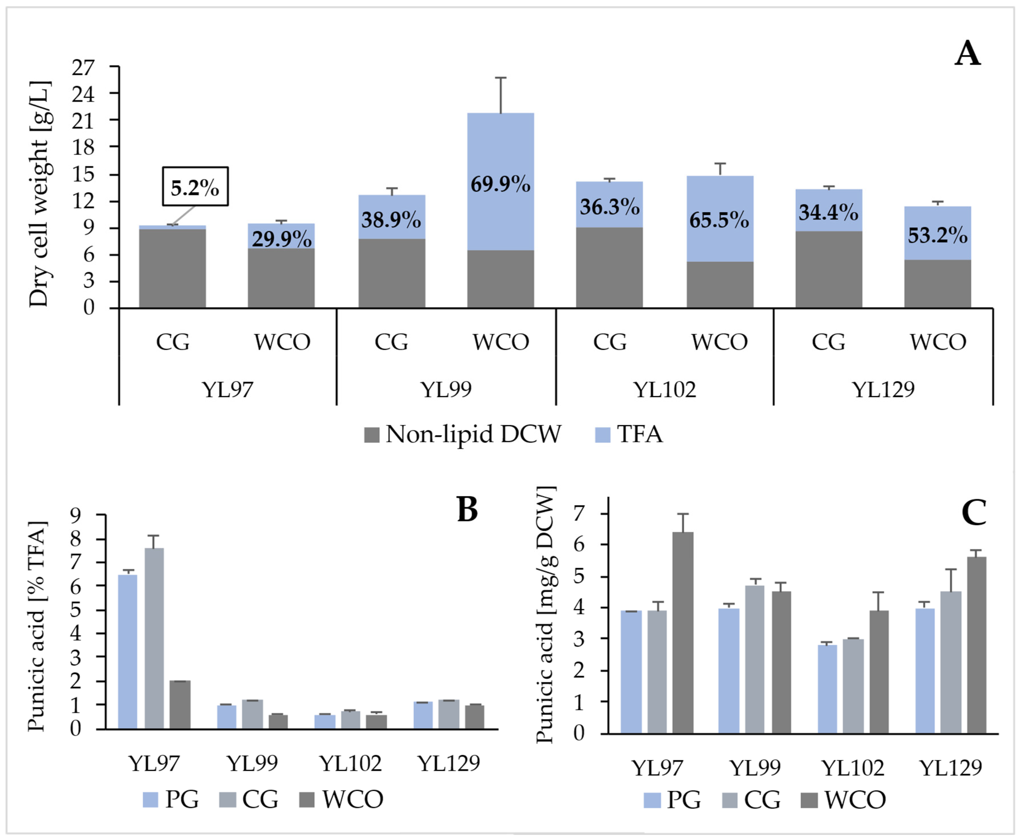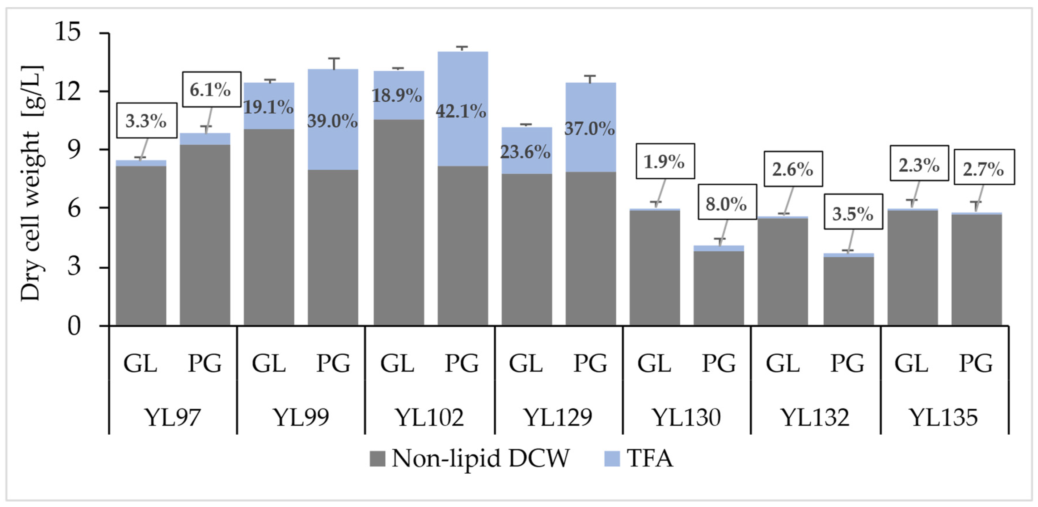 | TFA [% DCW] | 43.0 ± 1.6 | 41.0 ± 2.4 | 44.2 ± 1.0 | 31.0 ± 2.7 | 33.8 ± 3.0 | 38.5 ± 0.5 | 25.7 ± 5.4 |