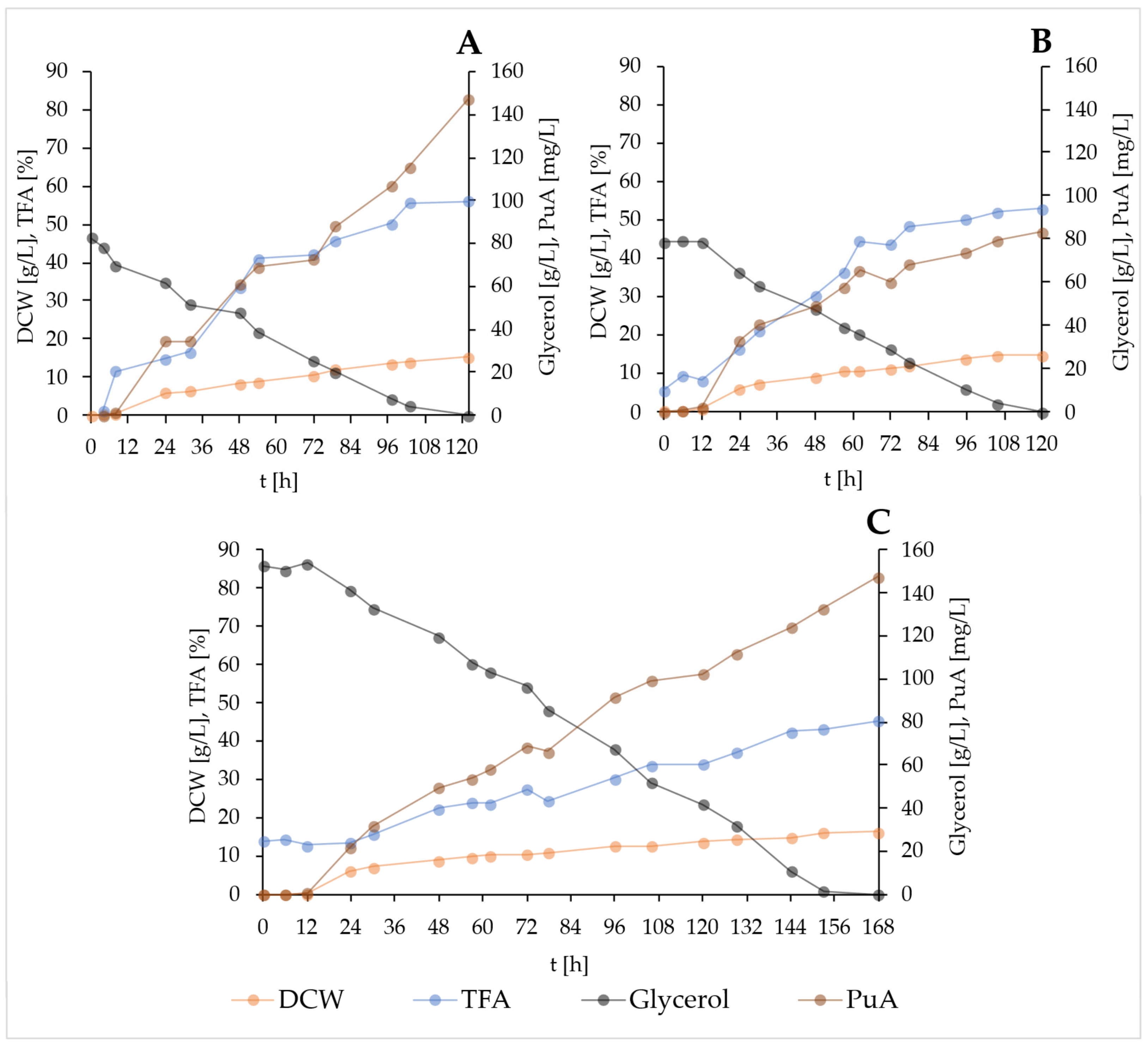 | PuA [mg/g DCW] | 5.5 ± 0.2 | 6.0 ± 0.6 | 5.4 ± 0.5 | 6.7 ± 0.6 | 7.2 ± 0.6 | 7.4 ± 0.8 | 5.8 ± 1.0 |