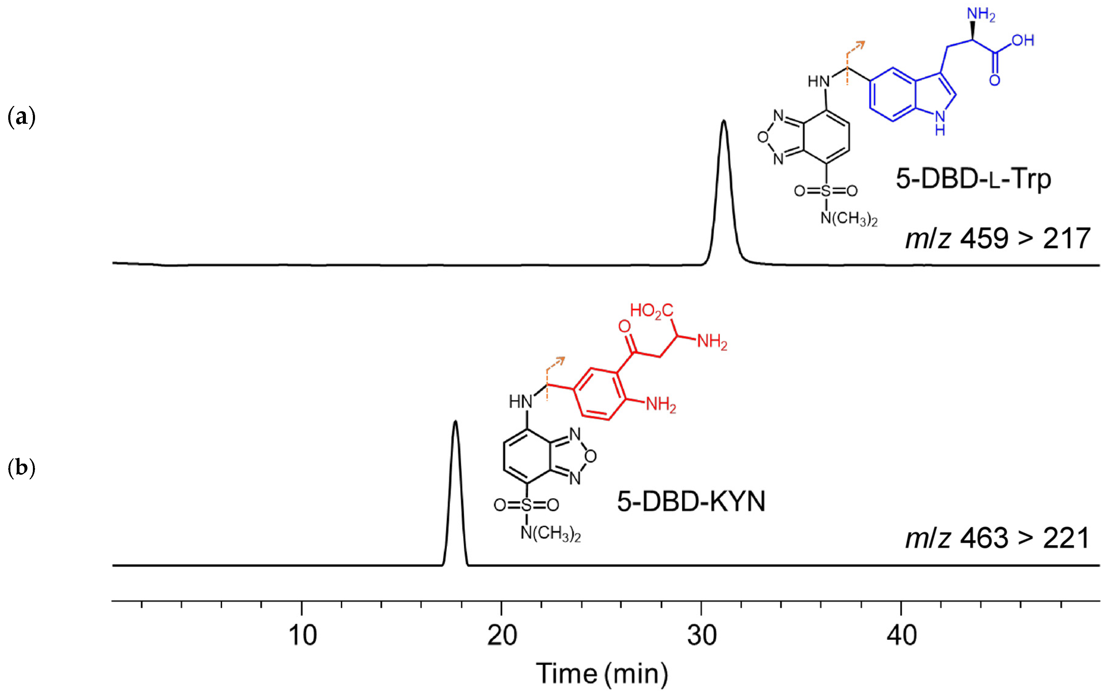 APA StyleOnozato, M., Aoki, R., Yamaguchi, M., Fujimoto, H., Sakamoto, T., & Fukushima, T. (2026). Development of a Fluorophore-Bound l-Tryptophan Derivative for Evaluating Indoleamine 2,3-Dioxygenase Activity by HPLC with Fluorescence Detection: An In Vivo Microdialysis Study Using Rat Kidney. Molecules, 31(2), 283. https://doi.org/10.3390/molecules31020283
