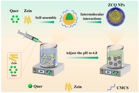 In this work, ZCQ NPs were synthesized via an anti-solvent precipitation method (Figure 1). Briefly, zein and Quer were first co-dissolved in an ethanol aqueous solution (80%, v/v), which was subsequently dropped into an aqueous phase. After that, the solubility of zein in the mixed solvent significantly decreased, resulting in the occurrence of supersaturation. The zein would be induced to nucleate when the supersaturation of the solution surpassed a threshold. Meanwhile, the zein would self-assemble into nanoparticles (ZNPs), while the co-dissolved Quer was encapsulated into ZNPs via hydrophobic interactions. Lastly, the pH value of the system was adjusted to 6.8 with acetic acid to induce the self-aggregation of CMCS. And the glucose–carbon skeleton of CMCS would interact with the hydrophobic amino acids of zein under the intermolecular interactions (e.g., hydrophobic interaction). Finally, ZCQ NPs were successfully synthesized.