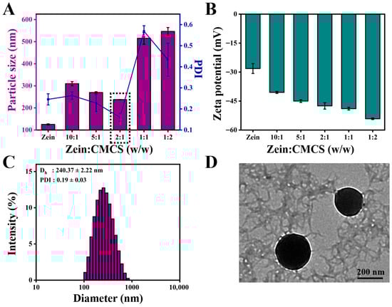 Zein/carboxymethyl chitosan nanoparticles (ZC NPs) were prepared based on a previously described anti-solvent precipitation method with minor modifications [48]. In brief, 100 mg of zein was dissolved in 5 mL of 80% (v/v) ethanol aqueous solution with stirring at 500 rpm to obtain the zein stock solution. Subsequently, 10, 20, 50, 100 and 200 mg of CMCS were separately dissolved in 15 mL of water and stirred at 500 rpm for 2 h for complete hydration. The prepared zein stock solution underwent rapid dropwise addition into the CMCS solution. Then, the pH of the system was adjusted to 6.8 with 10% acetic acid, followed by magnetic stirring for 3 h. The ethanol within the system was subsequently extracted via a rotary evaporation method. The lost liquid was replenished with deionized water to obtain the ZC NPs dispersion.