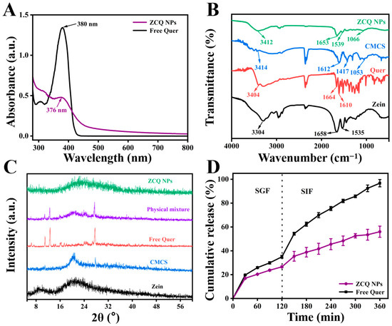 (A) UV-vis absorption spectra of free Quer and ZCQ NPs. (B) FT-IR spectra of zein, Quer, CMCS and ZCQ NPs. (C) XRD patterns of zein, CMCS, Quer, physical mixture and ZCQ NPs. (D) In vitro release profiles of ZCQ NPs and free Quer.