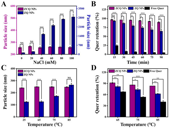 Nanosystems might be exposed to high temperatures during the production and transportation processes. Therefore, the stability of free Quer, ZQ NPs and ZCQ NPs at different temperatures was investigated. As shown in Figure 4C, the particle size of ZQ NPs exhibited a significant increase (from 124.03 nm to 264.27 nm) with the elevation of the water bath temperature. In contrast, the particle size of ZCQ NPs did not present obvious fluctuation under the test temperatures, which suggested that ZCQ NPs possessed increased anti-aggregation properties under thermal treatment. Meanwhile, the retention rates of ZCQ NPs, ZQ NPs and free Quer after heating were also measured. As can be seen in Figure 4D, the retention rates of free Quer were 67.53%, 53.43% and 40.36% after 30 min of heating at 65, 75 and 85 °C, respectively. However, the retention rates of ZCQ NPs were 91.69%, 86.05% and 83.26%, respectively, which are obviously higher than those of ZQ NPs (the retention rates of ZQ NPs were 83.51%, 72.46% and 62.13% after being inducted at 65, 75 and 85 °C, respectively). This outcome agreed well with the work of Sun et al., which demonstrated that the synthesized nanoparticles could exert superior protective effects on Quer against thermal stress [37]. A possible reason for the increased stability was that Quer had been encapsulated within the hydrophobic cavities of ZCQ NPs, which reduced the impact of external temperatures on Quer [38].