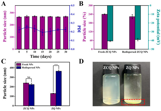 (A) Particle size of ZCQ NPs after 0, 5, 10, 15, 20, 25 and 30 days of storage. (B) Particle size and zeta potential of fresh and redispersed ZCQ NPs. (C) Particle size of fresh and redispersed ZCQ NPs and ZQ NPs. (D) The visual appearance of redispersed ZCQ NPs and ZQ NPs. (NS: p > 0.05, *** p < 0.001).