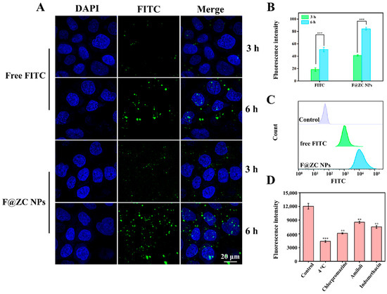 For a better comparison of the cellular uptake of free FITC and F@ZC NPs, quantitative analysis was also performed via flow cytometry.