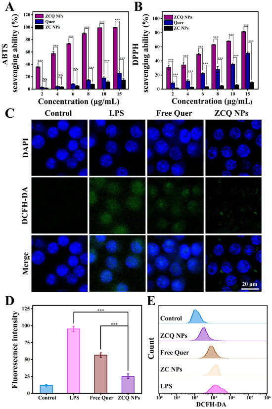 (A) ABTS- and (B) DPPH radical-scavenging activities of free Quer, ZC NPs and ZCQ NPs. (C) The CLSM images of intracellular ROS in LPS-activated RAW 264.7 cells treated with free Quer and ZCQ NPs. (D) Statistical chart of fluorescence intensity of ROS in RAW 264.7 cells. (E) The fluorescence intensity of ROS in RAW 264.7 cells treated with different samples was determined by flow cytometry. (NS: p > 0.05, *** p < 0.001).