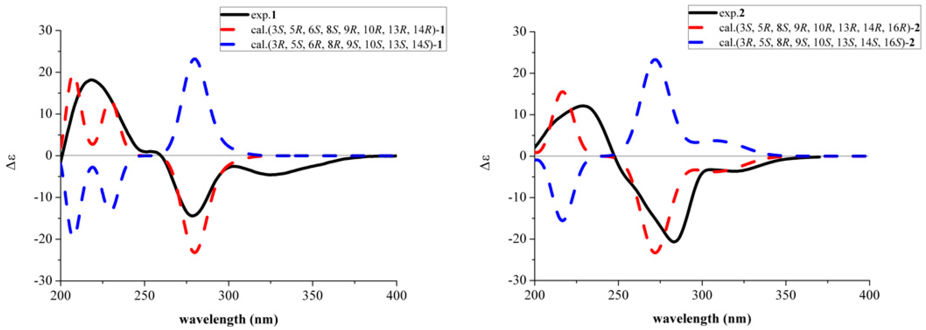 - Pang, X.; Lin, X.; Wang, J.; Liang, R.; Tian, Y.; Salendra, L.; Luo, X.; Zhou, X.; Yang, B.; Tu, Z.; et al. Three new highly oxygenated sterols and one new dihydroisocoumarin from the marine sponge-derived fungus Cladosporium sp. SCSIO41007. Steroids 2018, 129, 41–46. [Google Scholar] [CrossRef]