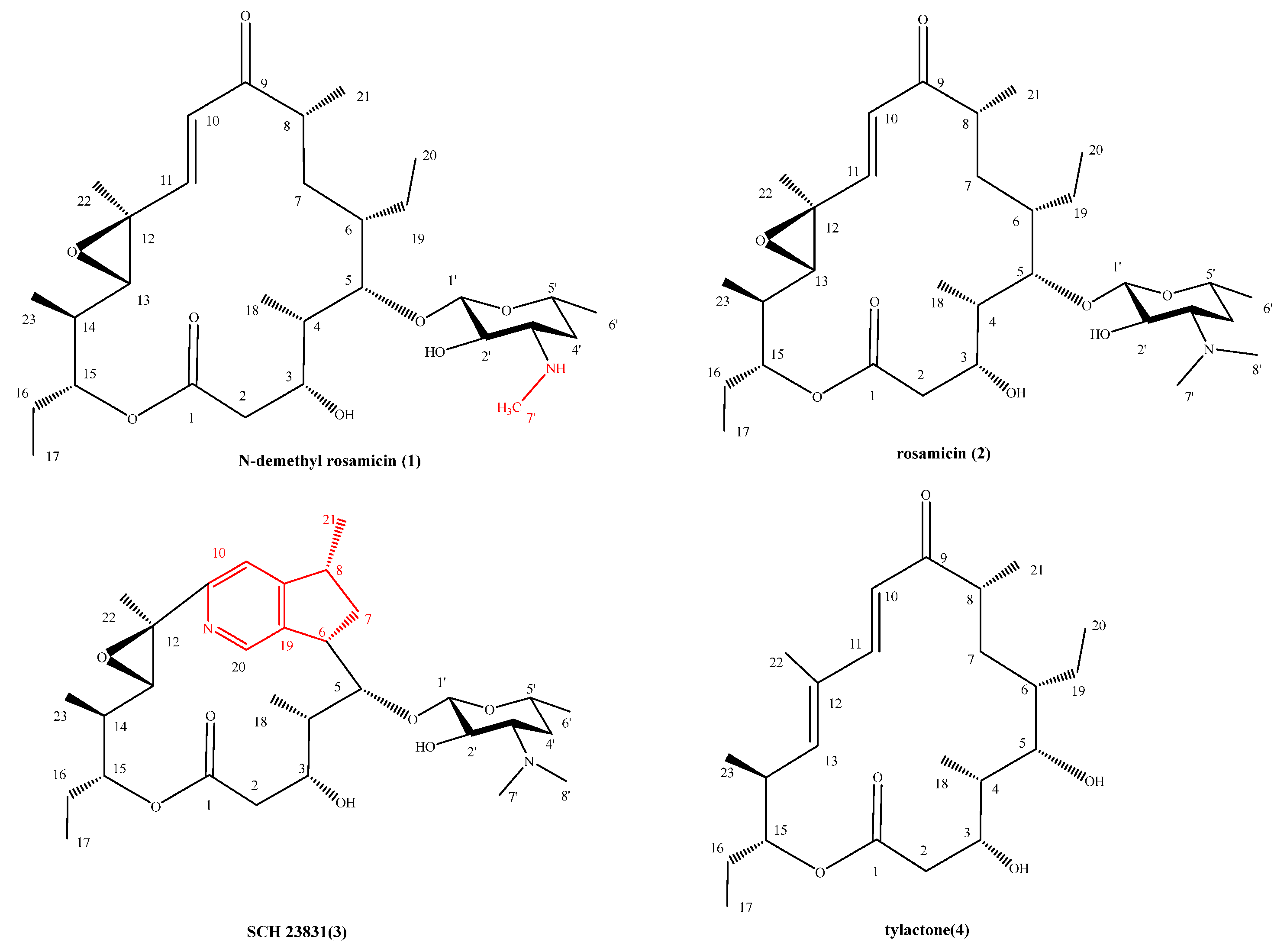 - Puar, M.S.; Schumacher, D. Novel macrolides from Micromonospora rosaria. J. Antibiot. 1990, 43, 1497–1501. [Google Scholar] [CrossRef][Green Version]