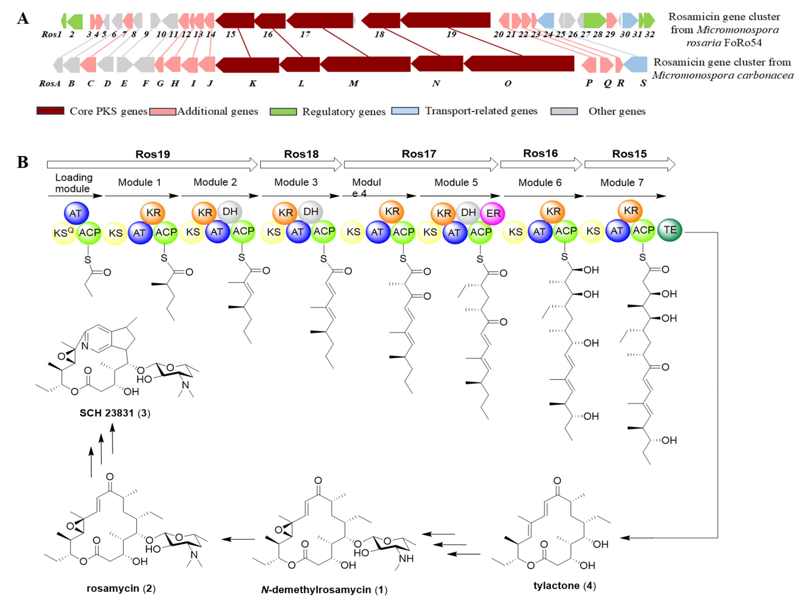 2.5. Propose Biosynthetic Pathway of Rosamicin-Type Compounds