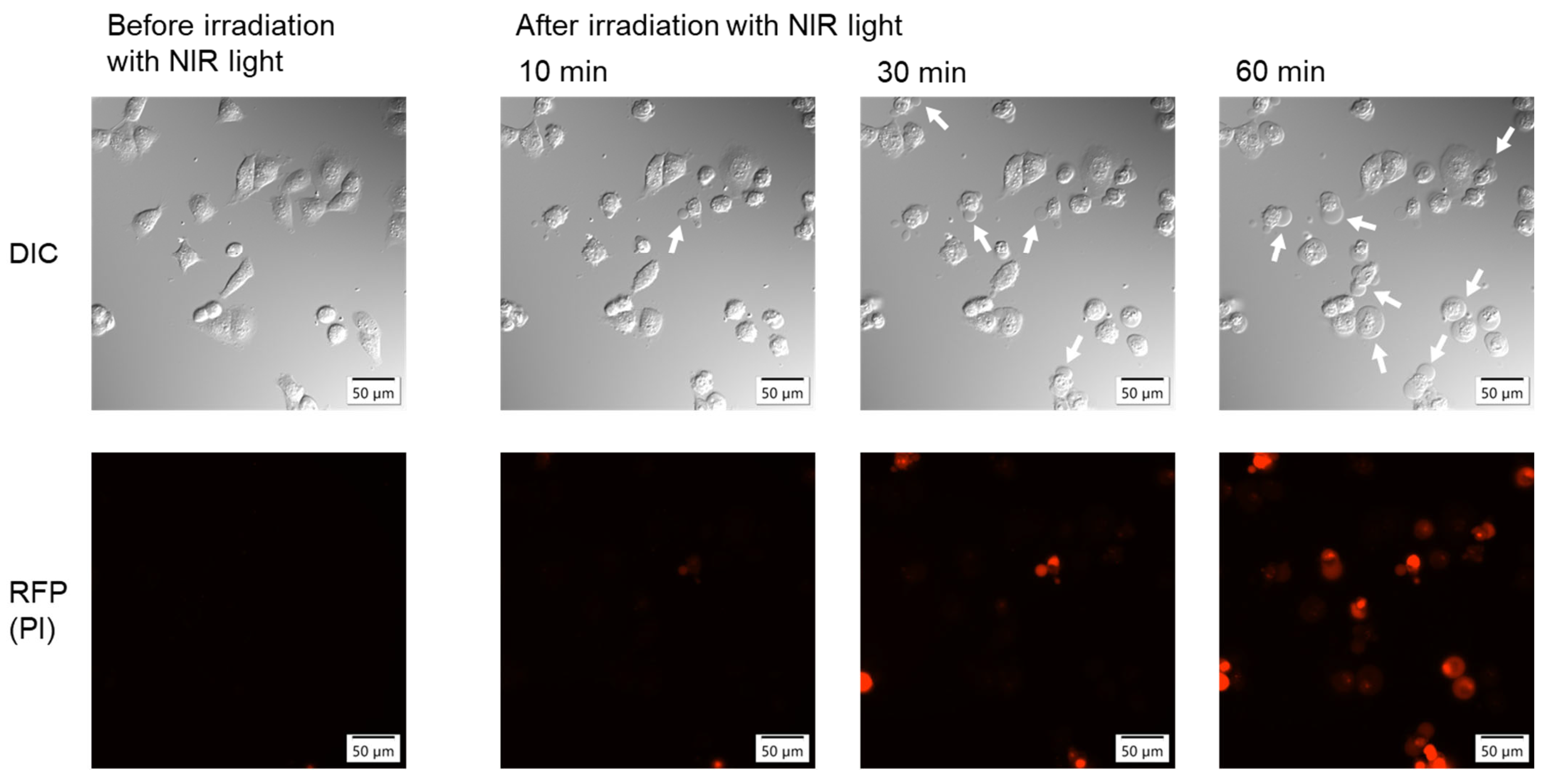 - Sato, K.; Okada, T.; Okada, R.; Yasui, H.; Yamada, M.; Isobe, Y.; Nishinaga, Y.; Shimizu, M.; Koike, C.; Fukushima, R.; et al. Photoinduced actin aggregation involves cell death: A mechanism of cancer cell cytotoxicity after near-infrared photoimmunotherapy. ACS Nano 2025, 19, 8338–8356. [Google Scholar] [CrossRef]