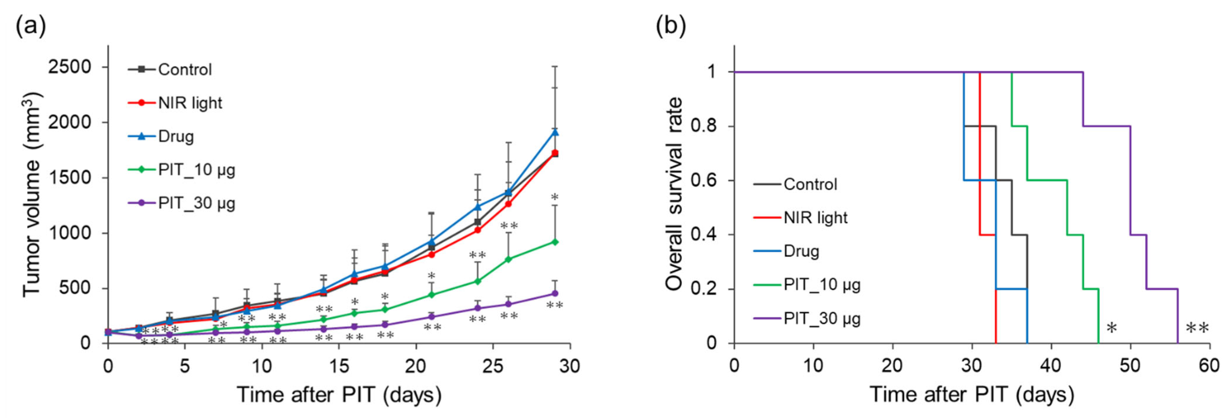 - Fan, Y.; Zhang, R.; Shi, J.; Tian, F.; Zhang, Y.; Zhang, L.; Liao, G.; Yang, M. Mild near-infrared laser-triggered photo-immunotherapy potentiates immune checkpoint blockade via an all-in-one theranostic nanoplatform. J. Colloid. Interface Sci. 2025, 678, 1088–1103. [Google Scholar] [CrossRef]