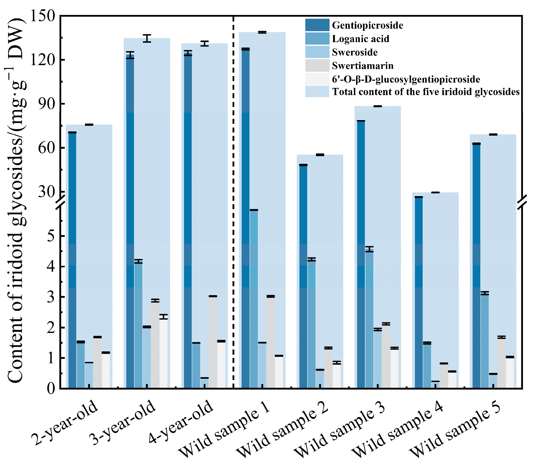 2.2.2. Analysis of Iridoid Glycoside Content Characteristics of Samples Under Different Cultivation Ages