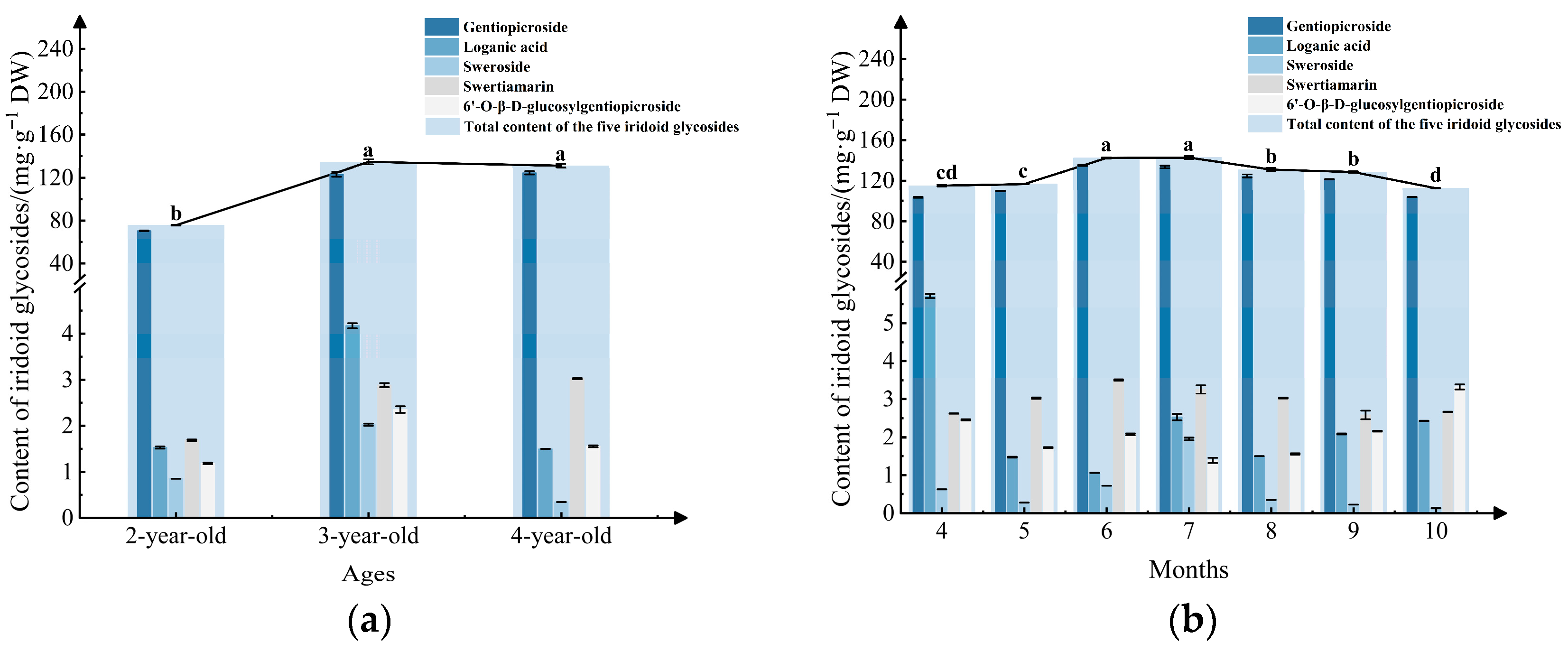 2.2.3. Analysis of Iridoid Glycoside Content Characteristics of Samples Harvested in Different Months