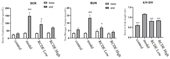 To investigate the effect of RCDE on renal function in CIAKI rats, a CIAKI rat model was established. As shown in Figure 2, in the model group, the post-modeling levels of Serum Creatinine (SCr) and Blood Urea Nitrogen (BUN) were increased by 315.24% (p < 0.001) and 299.41% (p < 0.001) compared with their respective baseline values. The high-dose RCDE group showed much lower increases in SCr and BUN, which were 93.46% and 38.13%, respectively. The kidney/body weight of the model group was significantly higher than that of the control group (p < 0.001), while it in both RCDE groups was significantly lower than that in the model group (p < 0.001).