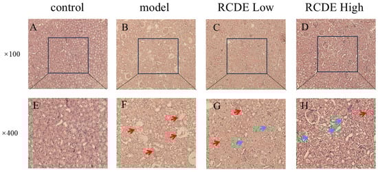 HE staining of renal tissues (n = 5). (A,E): Control group; (B,F): Model group; (C,G): Low-dose group; (D,H): High-dose group. The red arrows indicate the injured areas, while the blue arrows denote the recovered regions.