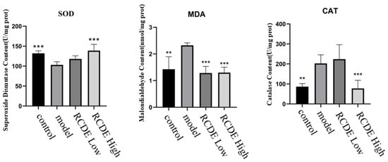 Given that oxidative stress injury frequently occurs in CIAKI, the oxidative stress status of the kidneys was detected. As shown in Figure 4, compared with the control group, the activity of SOD in the model group decreased significantly, while the contents of MDA and CAT increased significantly. Pre-intervention with different doses of high-does RCDE, compared with the model group, exhibited a significant decrease in MDA content and CAT activity as well as a significant increase in SOD activity in renal tissues (all p < 0.001).