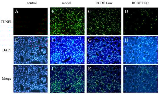 Comparative analysis of TUNEL staining across different experimental groups (n = 5, 200×). The figure presents fluorescence microscopy images of (A–D) TUNEL staining, (E–H) DAPI staining, and (I–L) merged images combining both channels. The columns represent four distinct experimental conditions: Control (A,E,I), Model (B,F,J), RCDE Low-dose treatment (C,G,K), and RACE high-dose treatment (D,H,L).