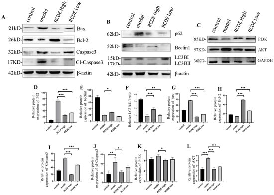 RCDE Regulates Apoptosis and Autophagy-related Protein Expression in Renal Tissues of CIAKI Rats (n = 3). (A) Representative WB bands of apoptosis-related proteins (Bax, Bcl-2, Caspase3); (B) autophagy-related proteins (p62, Beclin1, LC3B-I/II) with β-actin as the loading control; and (C) PI3K, AKT with GAPDH as the loading control (D–L) Quantitative analysis of relative protein expression levels (normalized to β-actin and GAPDH). The data are presented as mean ± SD from three independent biological replicates. * p < 0.05, ** p < 0.01, *** p < 0.001 vs. model group.