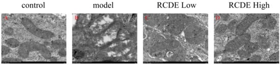 Effects of RCDE on mitochondrial autophagy (n = 3, 10,000×). (A): Control group; (B): Model group; (C): Low-dose group; (D): High-dose group.