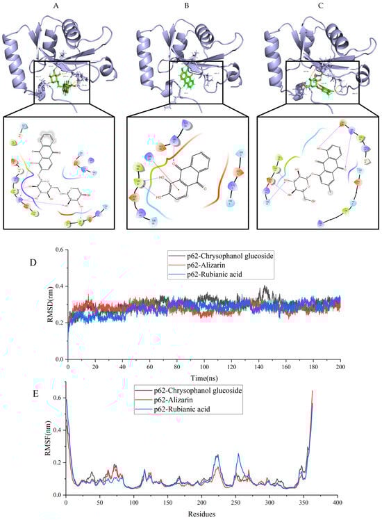 Visualization of molecular docking between p62 and the main chemical components of RCDE. (A) Rubianic acid; (B) Alizarin; (C) Chrysophanol glucoside; (D) Time-dependent RMSD of modeled to p62 with Rubianic acid, Alizarin and Chrysophanol glucoside in 200 ns of MDs; (E) RMSF analysis of MDs for protein–ligand complexes.