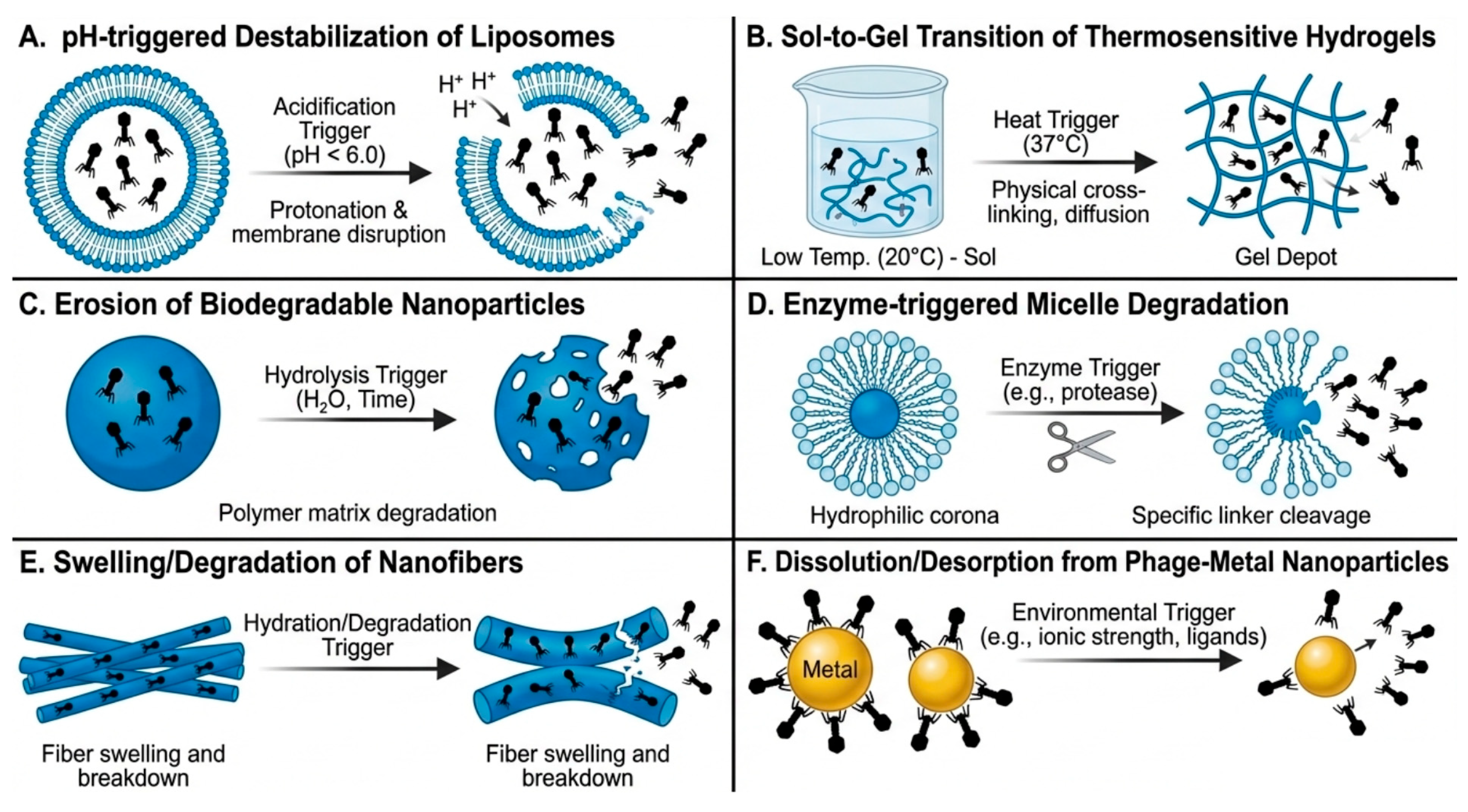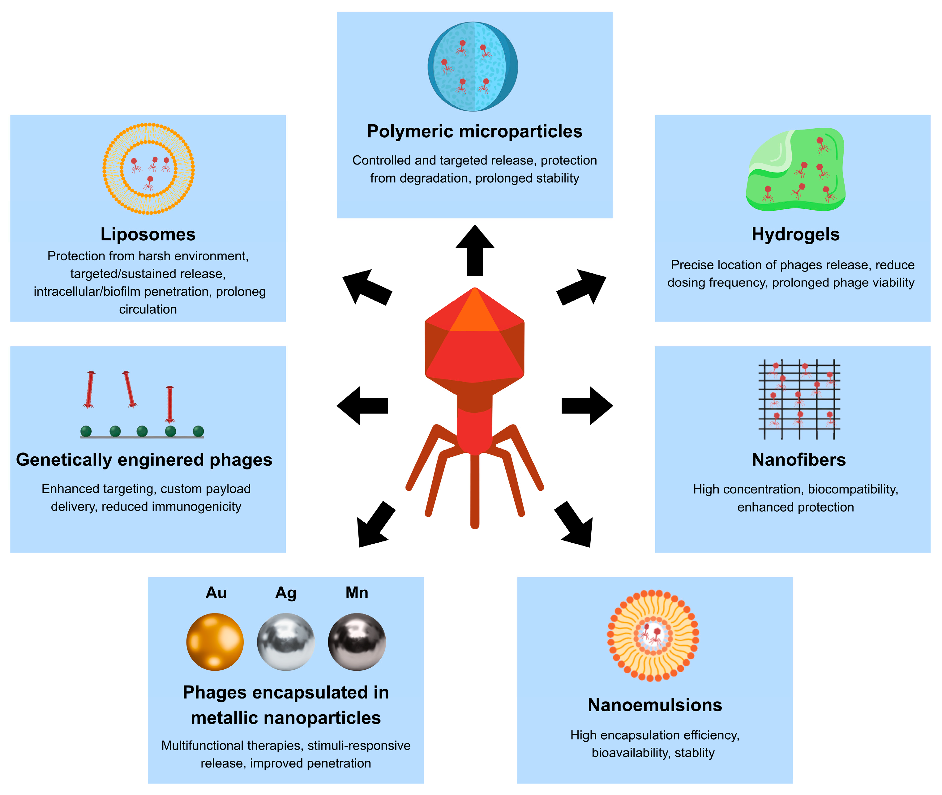 - Patil, R.; Arora, S.; Kumar, D.; Agrawal, A.K. Multifunctional Nanocarriers in Bacteriophage Delivery: A Paradigm Shift in Treating Multidrug-Resistant Infections. WIREs Nanomed. Nanobiotechnology 2025, 17, e70021. [Google Scholar] [CrossRef] [PubMed]
