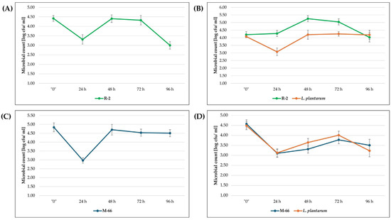 In the case of strain R-2, a higher abundance was observed than in L. plantarum, in contrast to the results for strain M-66. All presented cultures show a decrease in the number of microorganisms within the first 24 h after the start of cultivation, followed by an increase. The exception is the culture of strain R-2 in variant III (Figure 1B).