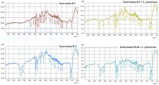 When comparing the powder spectra for the variants containing the highest TFC, i.e., R-2 and R-2, with L. plantarum, a clearer separation of absorption bands could be observed at wavelengths of 2000–2400 cm−1 (Figure 2).